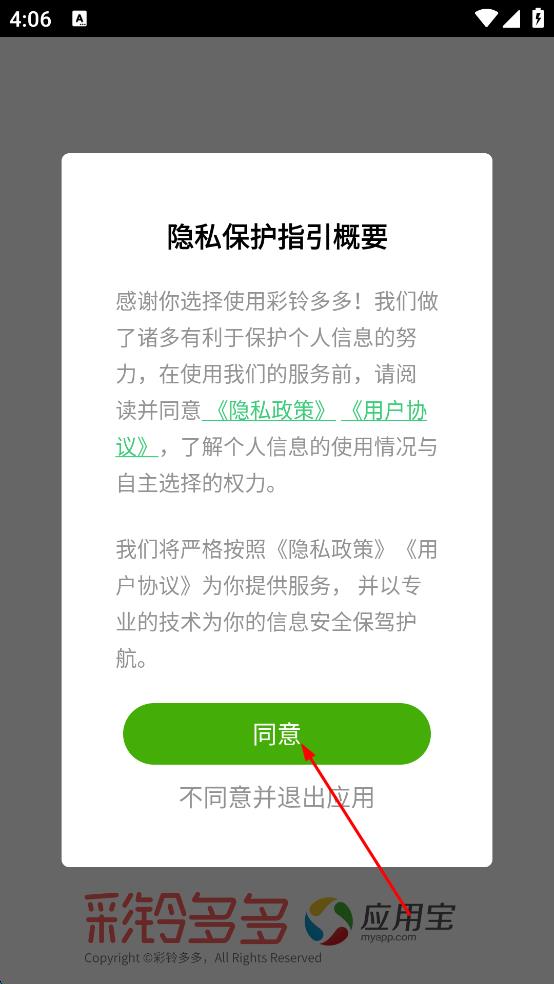 1、打開彩鈴多多APP,彈出隱私保護(hù)指引概要,點(diǎn)擊同意,確認(rèn)接受隱私政策與用戶協(xié)議進(jìn)入首頁(yè)。