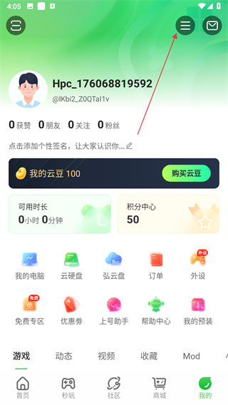 1、打開弘電腦APP,進(jìn)入我的頁(yè)面,點(diǎn)擊右上角三條橫線的菜單按鈕。