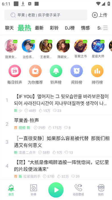 火熱鈴聲實(shí)時(shí)更新,把握時(shí)尚風(fēng)向標(biāo),網(wǎng)羅分享量超高的鈴聲,匯總個(gè)性又流行的彩鈴(炫鈴)……