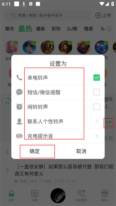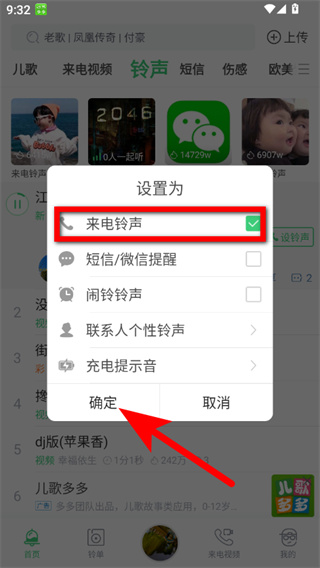 4、緊接著,點(diǎn)擊【設(shè)鈴聲】會(huì)自動(dòng)彈出彈窗,選擇第一個(gè)【電話鈴聲】并點(diǎn)擊確定;
