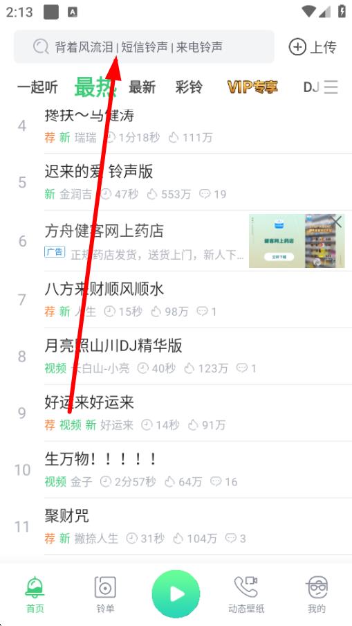 1、在鈴聲多多首頁,點(diǎn)擊鈴聲選項(xiàng),進(jìn)入鈴聲列表頁面。