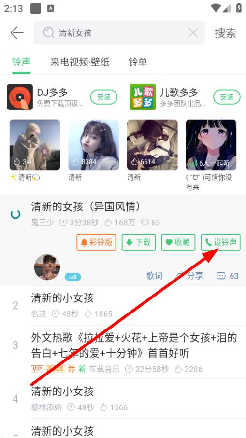 4、搜索結(jié)果頁面會(huì)展示相關(guān)歌曲,找到心儀歌曲后,點(diǎn)擊歌曲右側(cè)的設(shè)鈴聲等按鈕即可進(jìn)行相關(guān)操作。