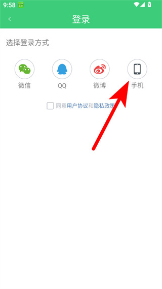 3、在登錄頁面,點(diǎn)擊手機(jī)選項(xiàng),進(jìn)入手機(jī)號(hào)登錄界面。