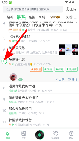 2、隨后,大家進(jìn)入首頁可以看到海量的鈴聲,可隨機(jī)挑選自己感興趣的音樂并點(diǎn)擊;