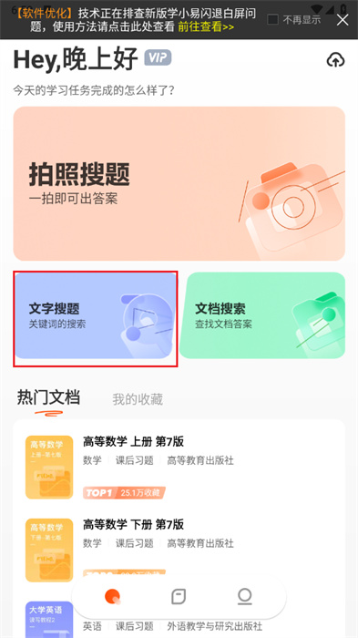 1、進(jìn)入應(yīng)用之中后,可以點(diǎn)擊【文字搜題】欄目,以進(jìn)行文字型題目的搜索;