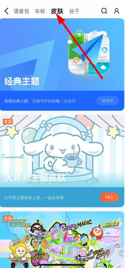 3、進(jìn)入語(yǔ)音包頁(yè)面后,點(diǎn)擊上方的皮膚選項(xiàng),選擇喜歡的皮膚并應(yīng)用即可。