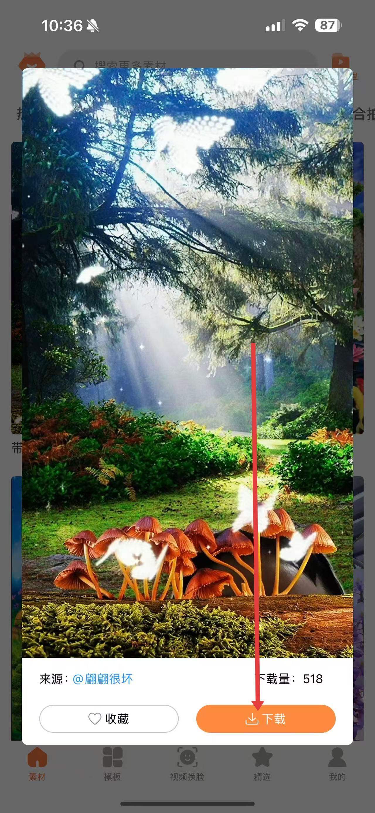 3、點擊選中的素材,在彈出的窗口中點擊下載按鈕,下載完成后,就可以在創(chuàng)作視頻等操作中使用該素材了。