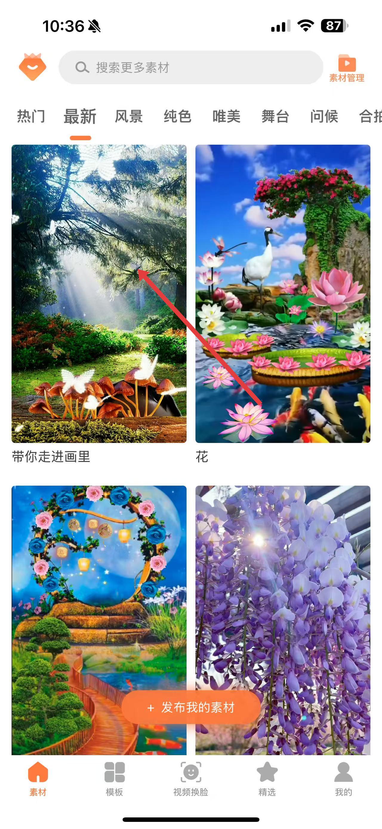 2、在素材頁面,瀏覽各類素材分類,比如熱門、最新等,找到自己需要的素材,像帶你走進(jìn)畫里。