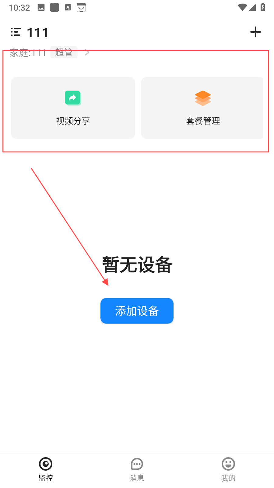 1、打開(kāi)移動(dòng)看家智能監(jiān)控軟件進(jìn)入主界面,查看頁(yè)面上方家庭名稱(chēng)及權(quán)限信息,若需添加監(jiān)控設(shè)備點(diǎn)擊下方藍(lán)色添加設(shè)備按鈕,根據(jù)提示操作完成設(shè)備與軟件的連。