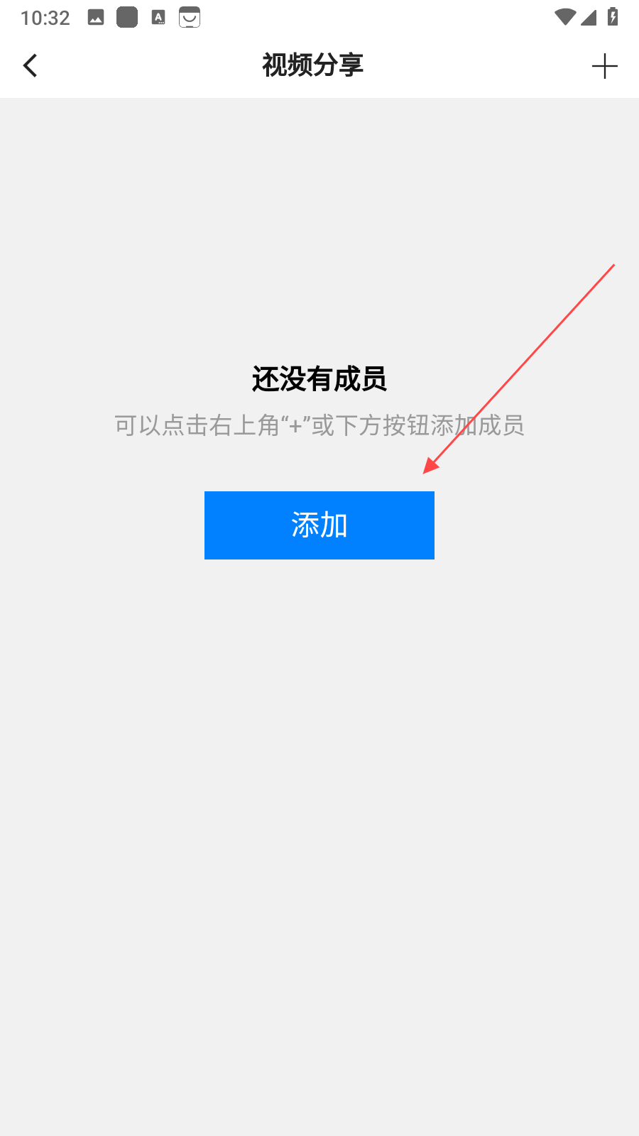 2、在主界面點(diǎn)擊視頻分享選項(xiàng)進(jìn)入相關(guān)頁(yè)面,點(diǎn)擊頁(yè)面中的藍(lán)色添加按鈕,按照軟件指引輸入接收分享成員的相關(guān)信息,完成后即可將監(jiān)控視頻分享給指定成員查看。