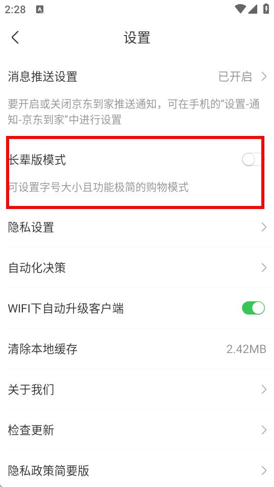 3、進入設置頁面后,找到長輩版模式選項,點擊長輩版模式右側的開關將其開啟。