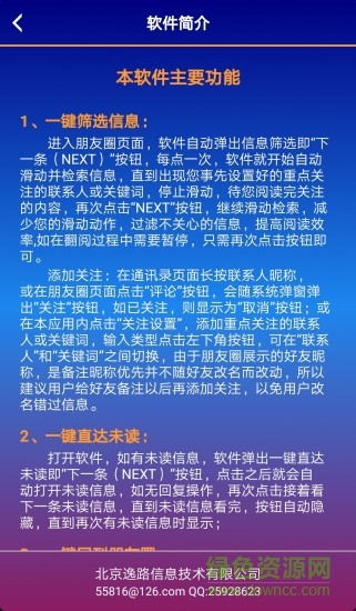 2.篩選朋友圈信息功能:你將不會再因為朋友圈信息多,沒時間刷完,而錯過親朋好友客戶的朋友圈信息,錯過互動機會,只需您預先設置重點關注的昵稱和關鍵字,即可點擊“NEXT VIPMSG”按鈕,由本軟件代您翻閱檢索,遇到您關注的聯(lián)系人或關鍵字,自動停止翻閱并作出提示,節(jié)省時間;