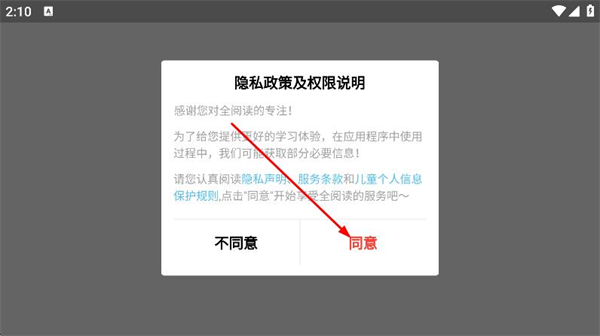 1、打開(kāi)全閱讀英語(yǔ)app,在彈出的隱私政策提示框中點(diǎn)擊同意。