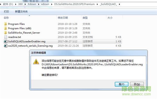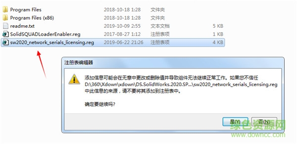 2.運(yùn)行_SolidSQUAD_文件夾內(nèi)的注冊表文件 “ sw2020_network_serials_licensing.reg,點(diǎn)擊是