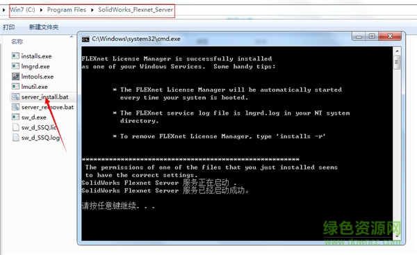 4.管理員身份運(yùn)行SolidWorks_Flexnet_Server \ server_install.bat,等待啟動成功