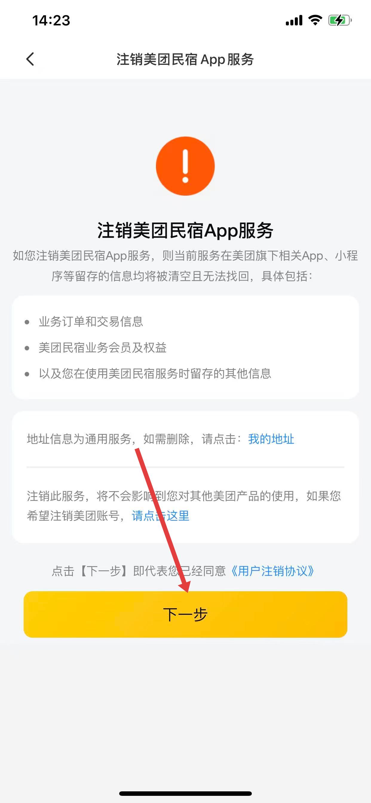 5、在注銷美團民宿App服務(wù)頁面,閱讀相關(guān)提示信息后,點擊下一步。