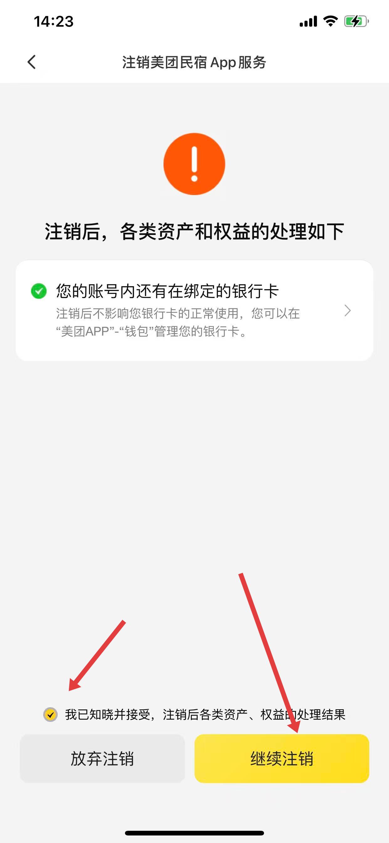 6、確認賬號內(nèi)資產(chǎn)和權(quán)益處理結(jié)果,勾選我已知曉并接受,注銷后各類資產(chǎn)、權(quán)益的處理結(jié)果,點擊繼續(xù)注銷。