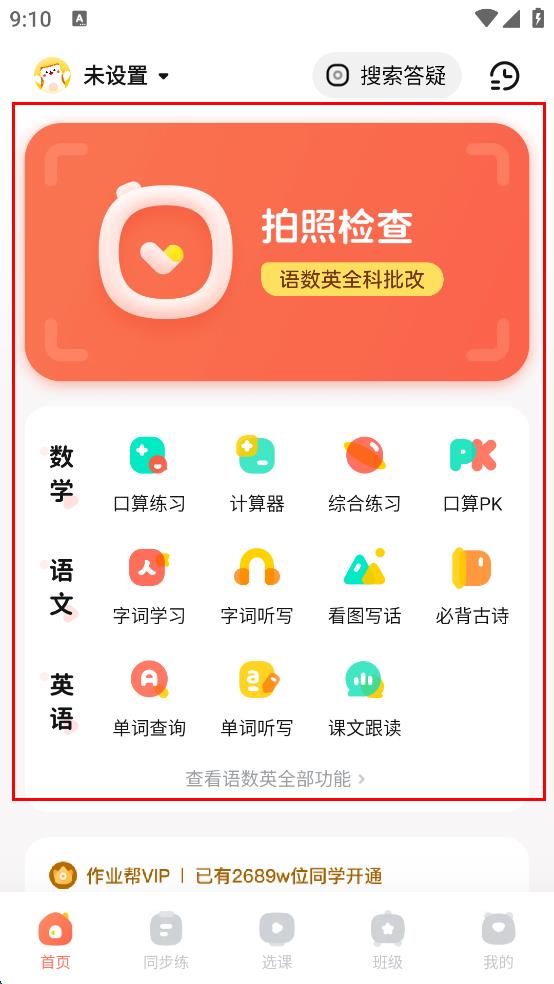 4、驗(yàn)證通過(guò)后,進(jìn)入作業(yè)幫口算主界面,可使用“拍照檢查”功能對(duì)語(yǔ)數(shù)英作業(yè)進(jìn)行全科批改,也能選擇數(shù)學(xué)、語(yǔ)文、英語(yǔ)學(xué)科下的各類(lèi)學(xué)習(xí)功能進(jìn)行學(xué)習(xí)。