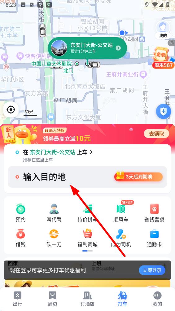 4、返回打車服務(wù)頁面,點擊輸入目的地框,輸入你要前往的地點,然后選擇合適的打車類型,即可呼叫車輛。