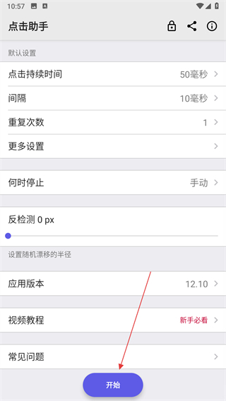 1、打開點(diǎn)擊助手應(yīng)用,點(diǎn)擊底部開始按鈕,啟動(dòng)點(diǎn)擊助手功能。