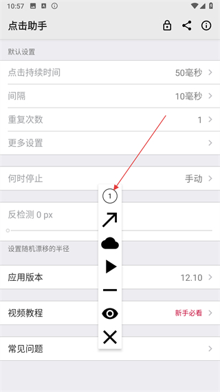 2、點(diǎn)擊開始后,界面彈出操作欄,點(diǎn)擊操作欄1圖標(biāo),可設(shè)置點(diǎn)擊動(dòng)作。