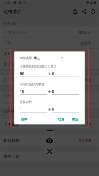 3.長按點(diǎn)擊位置的控件會(huì)彈出單點(diǎn)的參數(shù)配置,可以設(shè)置單點(diǎn)的延遲,觸摸時(shí)長,重復(fù)次數(shù)