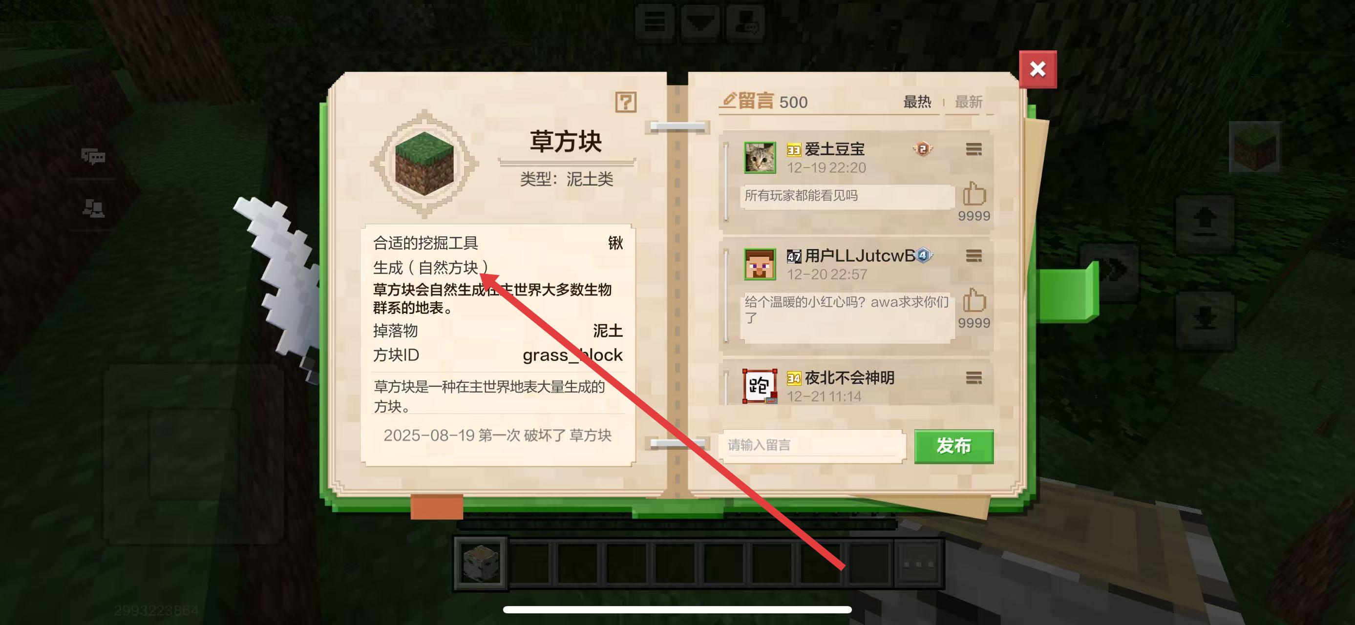 3、破壞草方塊后,打開物品百科,查看草方塊信息,可知其為泥土類、合適挖掘工具是鍬,了解生成與掉落等詳情。