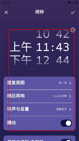 4、過會再鬧:上滑鬧鈴可設(shè)置一段時間后再次鬧起。