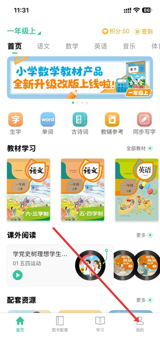 1、打開(kāi)人教點(diǎn)讀app,點(diǎn)擊底部導(dǎo)航欄中的我的選項(xiàng)。