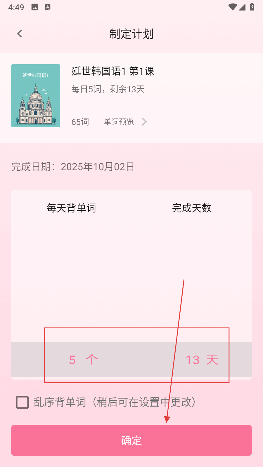 4、在制定計(jì)劃頁(yè)面,設(shè)置每天背單詞的數(shù)量和完成天數(shù),確認(rèn)后點(diǎn)擊確定。