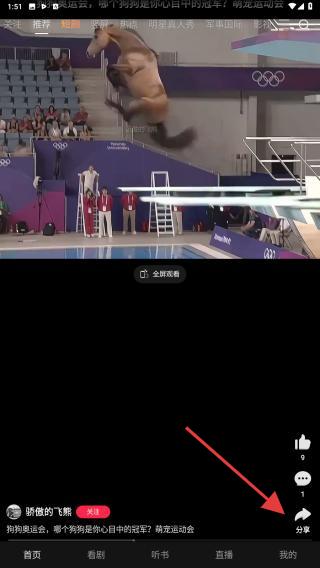 1、打開app進(jìn)入到首頁,在視頻右下方找到并點(diǎn)擊分享的功能按鈕。