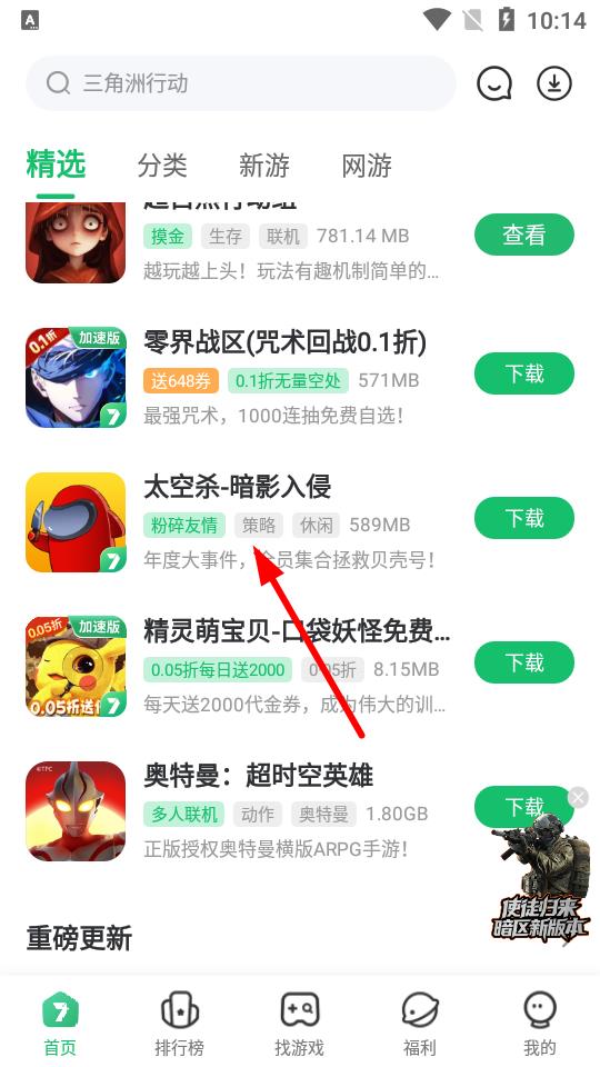 1、打開(kāi)7723游戲盒APP,在精選頁(yè)面瀏覽各類游戲,找到想玩的游戲,比如太空殺-暗影入侵。
