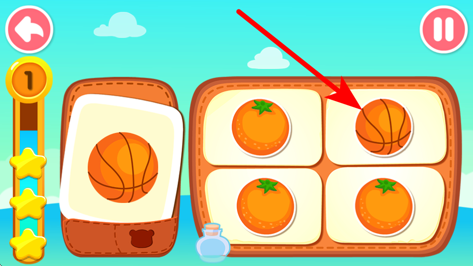 2、在配對關卡中,觀察左側目標圖案如籃球,在右側圖案區(qū)域找到相同的籃球并點擊,通過匹配相同物品推進關卡,確保配對準確。