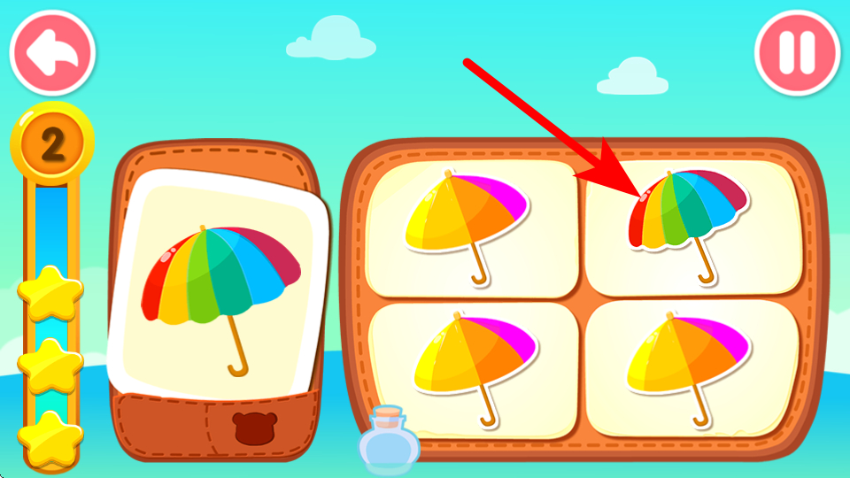 3、繼續(xù)觀察左側新的目標圖案如彩色雨傘,在右側圖案區(qū)域找到與之完全相同的雨傘并點擊,逐步完成多輪配對,鍛煉對物品特征的辨別能力。