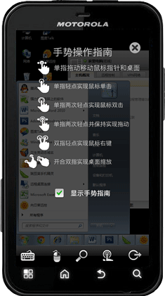 成功登錄遠(yuǎn)程主機(jī),將顯示手勢(shì)操作指南。向日葵Android版手機(jī)在手勢(shì)操作支持單指拖動(dòng)移動(dòng)鼠標(biāo)指針和桌面;單指輕點(diǎn)實(shí)現(xiàn)鼠標(biāo)單擊;單指兩次輕點(diǎn)實(shí)現(xiàn)鼠標(biāo)雙擊;單指兩次輕點(diǎn)并保持實(shí)現(xiàn)拖動(dòng);雙指輕點(diǎn)實(shí)現(xiàn)鼠標(biāo)右鍵;開合雙指實(shí)現(xiàn)桌面縮放等。