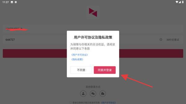 4、點(diǎn)擊后,會(huì)彈出用戶許可協(xié)議及隱私政策,點(diǎn)擊同意并登錄的按鈕即可。