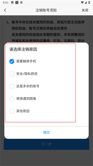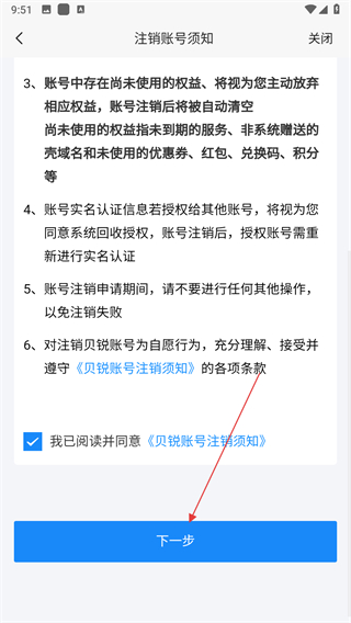 4、在注銷賬號(hào)須知頁面,點(diǎn)擊我已閱讀同意,然后點(diǎn)擊下一步。