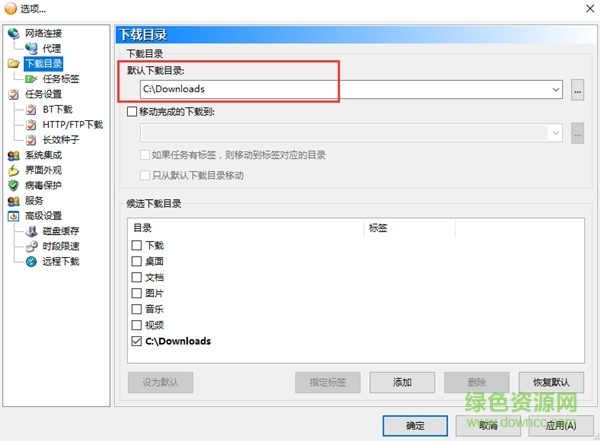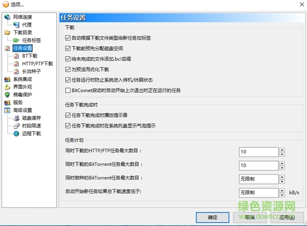第一步:打開BitComet,點擊“Ctrl+P”,彈出“選項”對話框,選擇“任務設置”,將默認的下載目錄由“C:Downloads”改為自己專用的下載目錄。