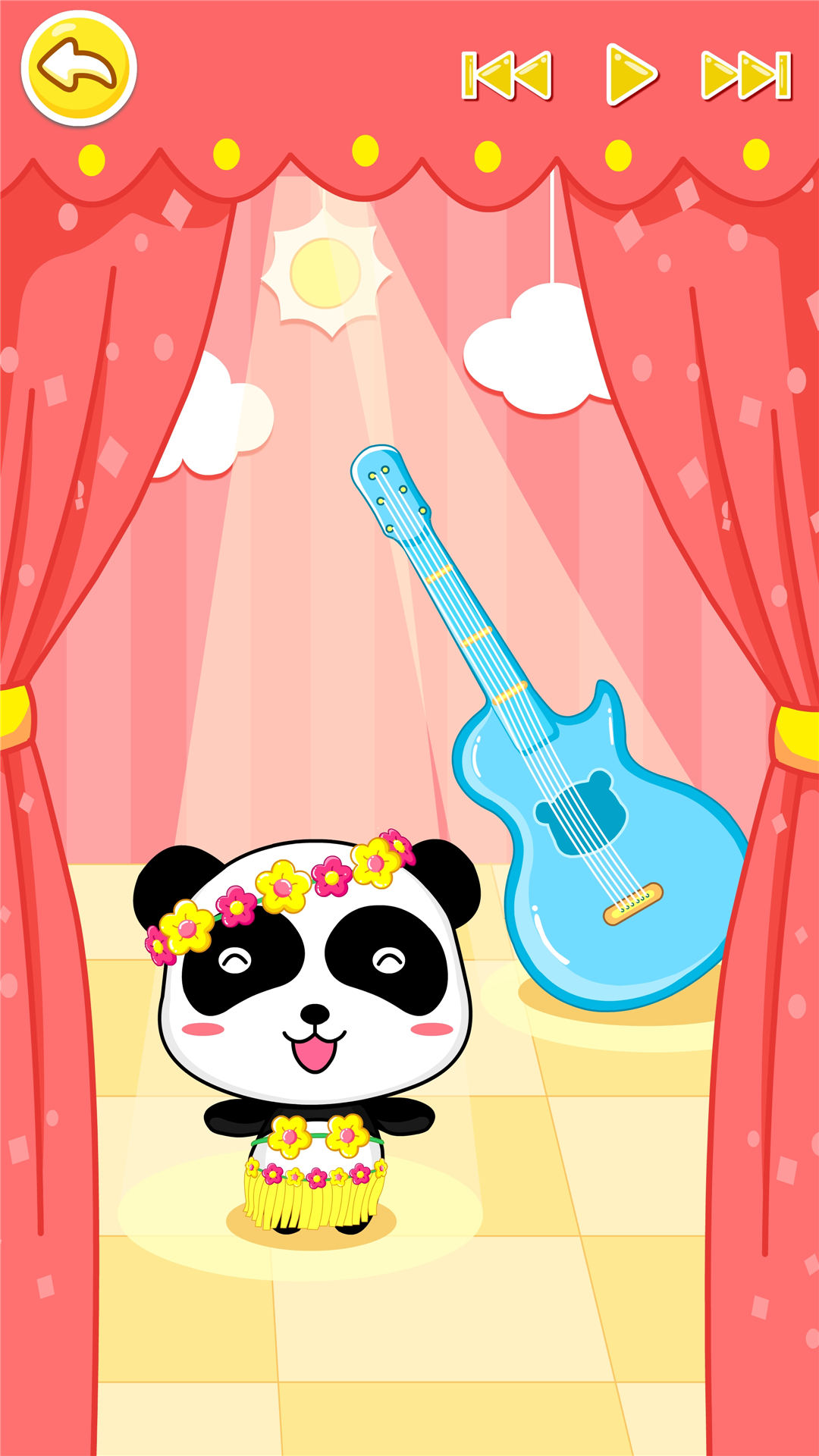 吉他:炫麗的舞臺上,小熊貓隨著音樂翩翩起舞,點(diǎn)擊舞臺上方的裝飾物,讓你驚喜連連!