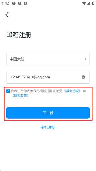 3、勾選點(diǎn)擊注冊即表示已閱讀并同意接受服務(wù)協(xié)議與隱私政策,點(diǎn)擊下一步。