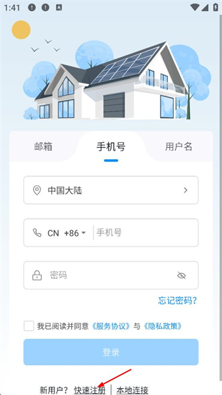 1、打開家居類APP,點(diǎn)擊登錄頁面的快速注冊。