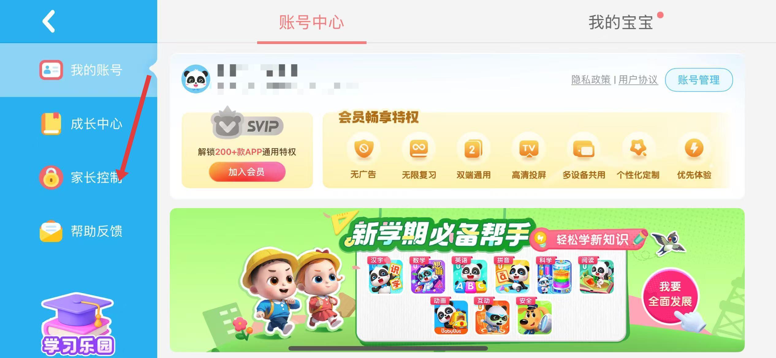1、點(diǎn)擊主界面右上角家長(zhǎng)中心圖標(biāo)。