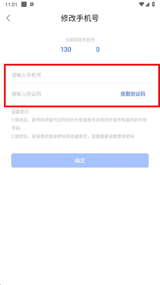 4、在修改手機(jī)號(hào)頁面輸入新的手機(jī)號(hào),獲取并輸入驗(yàn)證碼,點(diǎn)擊確定按鈕,即可完成手機(jī)號(hào)修改。