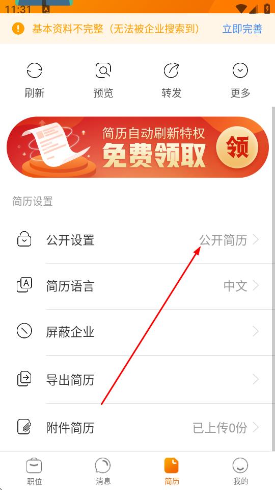3、在簡(jiǎn)歷頁面,找到并點(diǎn)擊公開設(shè)置選項(xiàng)。