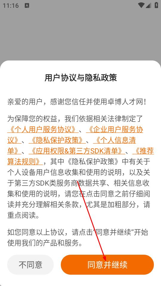 1、打開卓博人才網(wǎng)APP,在彈出的用戶協(xié)議與隱私政策頁面,點(diǎn)擊同意并繼續(xù)。