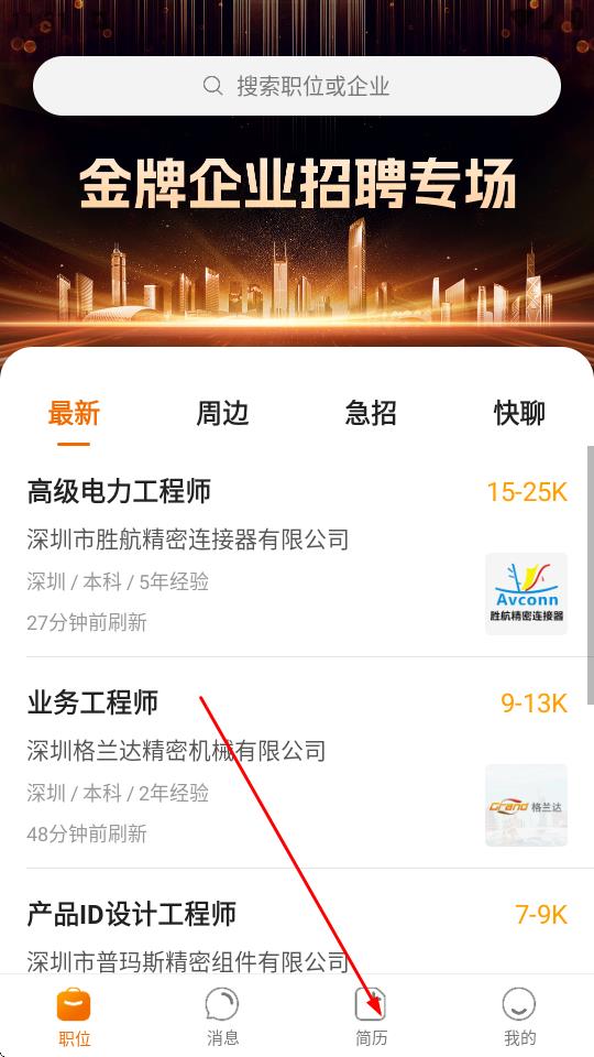 2、進(jìn)入APP首頁,點(diǎn)擊底部導(dǎo)航欄中的簡(jiǎn)歷。