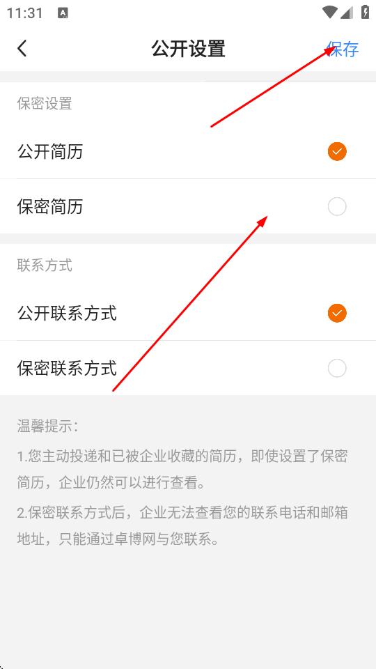 4、在公開設(shè)置頁面,選擇保密簡(jiǎn)歷,點(diǎn)擊保存,即可關(guān)閉簡(jiǎn)歷公開。