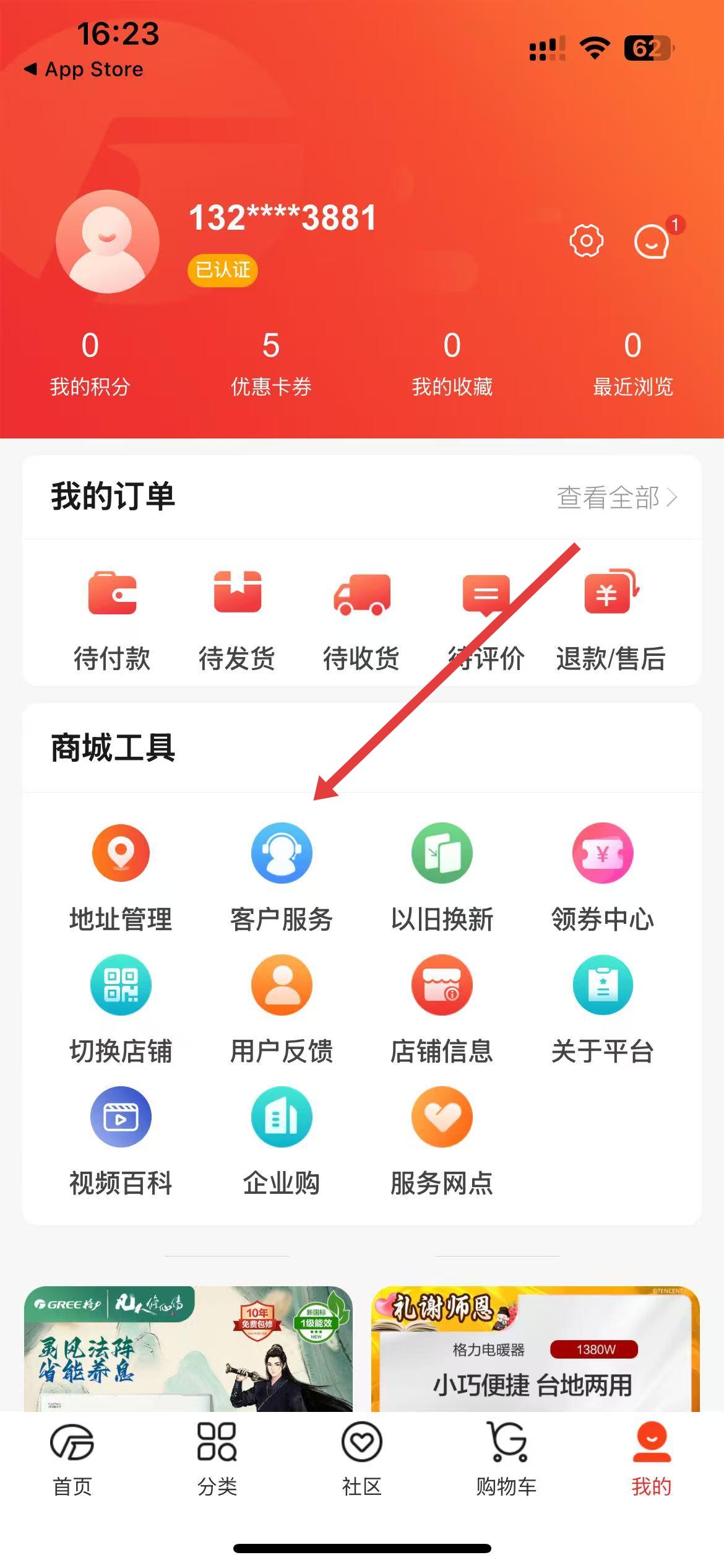 2、在個人中心頁面中找到商城工具板塊,點擊其中的客戶服務(wù)選項,進入在線咨詢界面。
