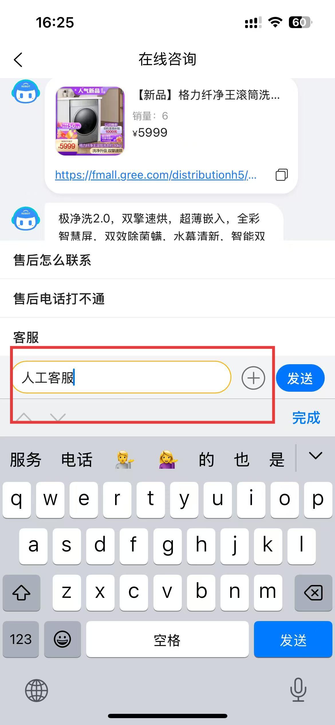 3、在線咨詢界面的輸入框中,輸入人工客服,然后點擊發(fā)送。