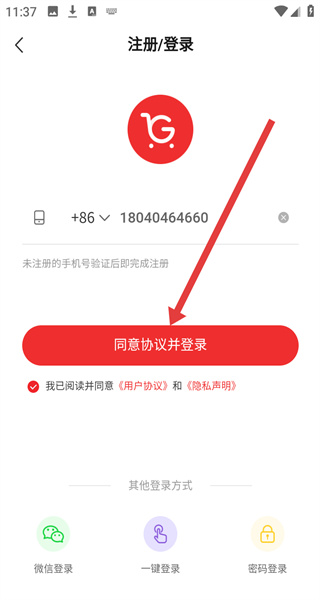 3、輸入手機號后,勾選“我已閱讀并同意《用戶協(xié)議》和《隱私聲明》”,點擊“同意協(xié)議并登錄”。